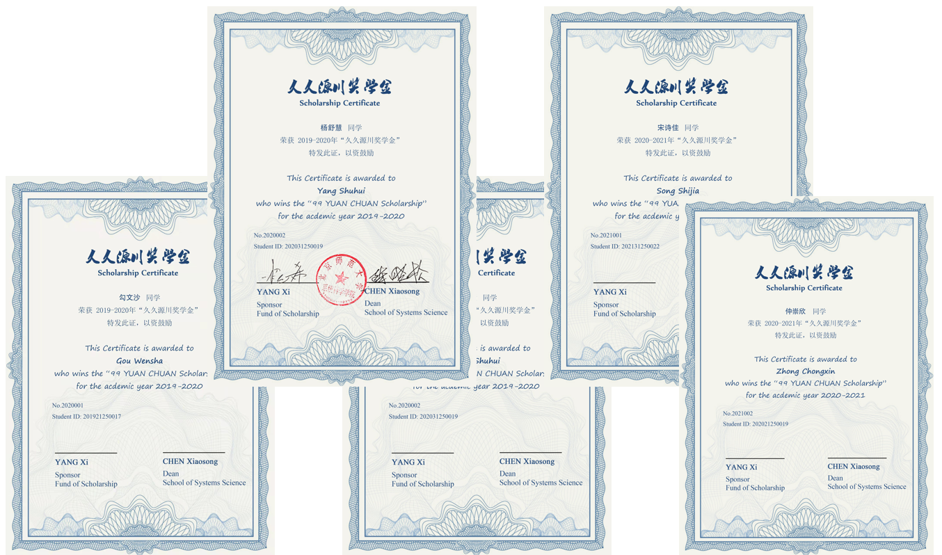“久久源川”奖学金由北京师范大学原系统科学系99级本科生于2014年向学校校友会捐赠设立,取自“饮水思源、海纳百川”之意。奖学金基金发起人为沣扬资本创始合伙人杨希,该奖学金每年设立2个名额,旨在奖励北京师范大学系统科学学院中家庭贫困或学习成绩优秀、综合素质突出的在校本科生和研究生。成立至今,学院已经有16名同学获得了资助。