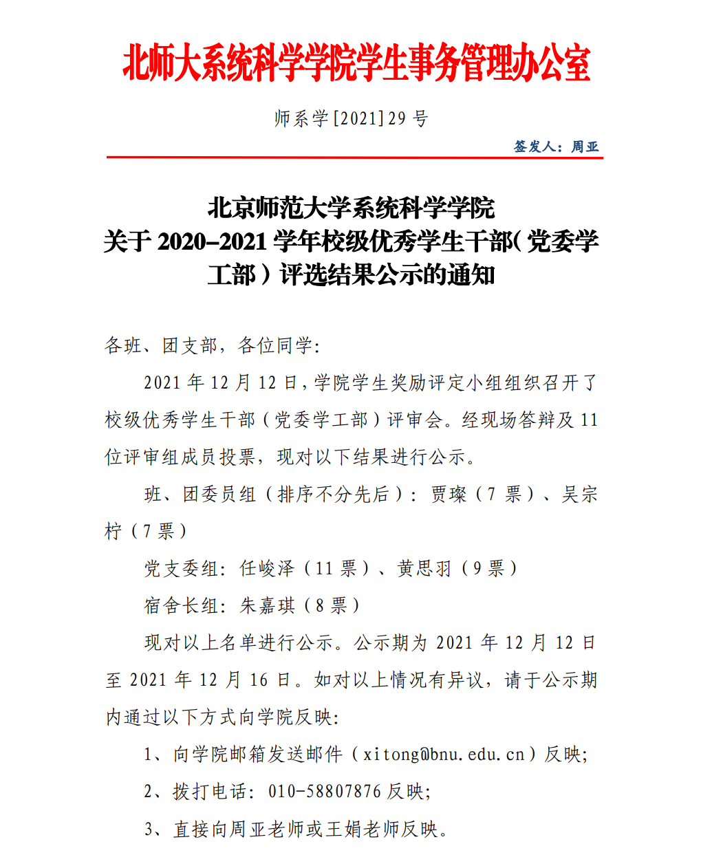 关于2020-2021学年校级优秀学生干部(党委学工部)评选结果公示的通知