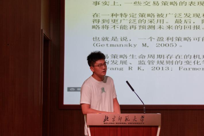 北京师范大学系统科学学院2019级直博生邢坤作题目为《交易策略生命周期的内在机制研究》的报告,报告中对市商模型进行介绍,验证了交易策略公开后获利能力下降的观点。大家就混合策略在研究中是否有意义展开讨论。