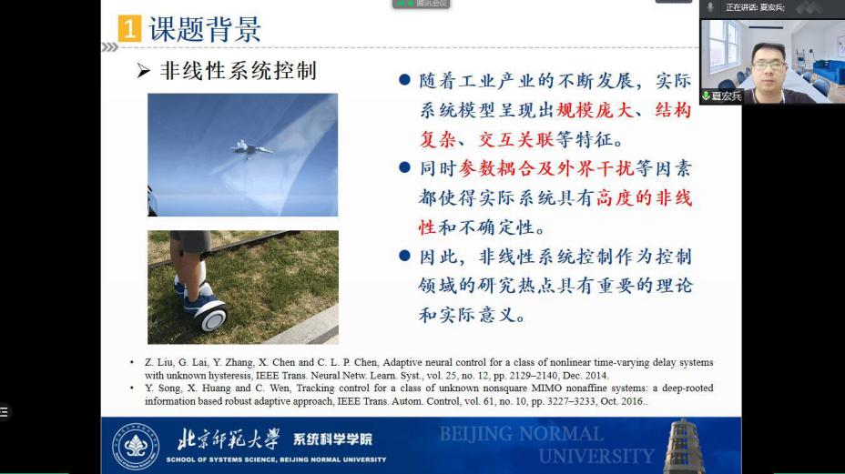 北京师范大学系统科学学院2020级博士生夏宏兵在珠海作题目为《基于滑模的一类非线性系统的自学习优化在线故障补偿控制》的线上报告,分享了一种基于滑模的在线故障补偿控制方案。现场提问中,大家就设计通用性及故障参数等方面进行了讨论。