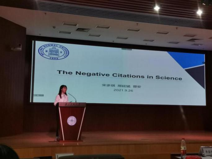 北京师范大学系统科学学院2020级硕士生宋多琪作题目为《the negative citation inscience》的报告。使用计算机语言领域的人工标记情感引用数据,构建有向符号引文网络,分析了引文情感以及如何论文质量判断。与会师生对符号网的构建以及引文情感分析进行了讨论并提出建设性意见。