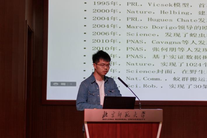 北京师范大学系统科学学院2019级博士生林国政作题目为《生物集群中的状态跃迁》的报告,介绍了集群运动状态跃迁在其临界性上的功能体现。大家就集群性质等问题现场展开了讨论。