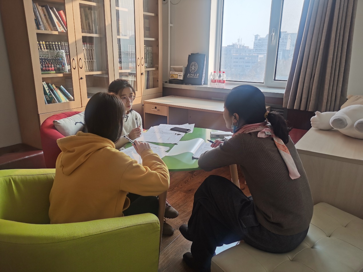 2022年1月7日下午14:00,在科技楼B803,系统科学学院团委书记王娟老师代表学院慰问冬奥会志愿者杨岚(2018级博士)和刘书佳(2021级博士)。两名志愿者服务场馆均为国家速滑馆。