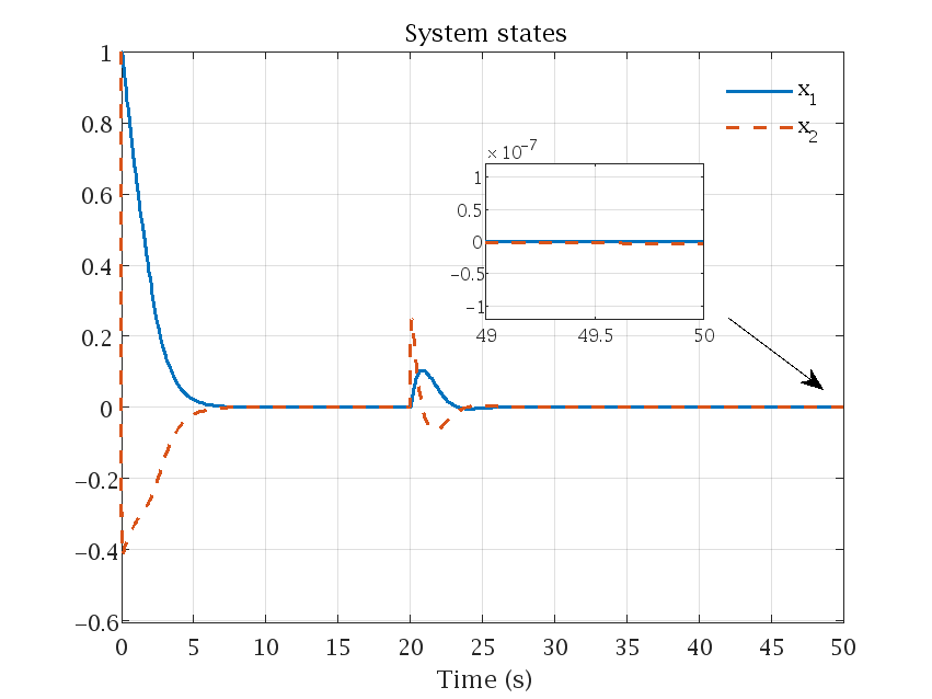 作者设计的安全调控系统原理结构示意图如图1所示。在该工作中,作者首先将两个玩家(控制输入和执行器故障)视为具有竞争行为的二体SLS系统,并将两个玩家同时引入设计系统的成本函数,进而构建HJI方程。然后,利用径向基神经网络建立一个辨识系统来学习未知的系统动力学模型信息。通过构建由协作自适应律调节的渐近稳定评判神经网络,求解HJI方程,获取近似最优安全调控策略。图2表示的是辨识系统的辨识误差演化轨迹,可以看出在短时间内,辨识误差可以被驱动到零。图3表示的是系统在t="20s发生执行器故障时,在神经最优安全调控策略的作用下,可以驱动系统状态收敛到平衡状态。图4表示的是评判网络权值演化轨迹。图5是两个玩家的演化轨迹,在t="20s发生执行器故障时,控制玩家和故障玩家的演化轨迹具有相反的趋势。这是由于在系统发生故障后,执行器故障会降低系统的控制性能,而系统最优控制为了对抗执行器故障的作用,以维持系统安全可靠的运行,故在短时间内会呈现波动。随着系统的演化,两者可以在短时间内达到稳定状态,即两个参与者达成了相互协议。