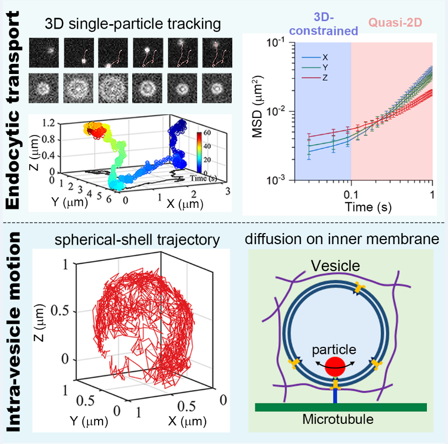 囊泡输运是细胞内物质、能量和信息交换的主要途径,也是细胞多种生理功能实现和调控的物理基础。病毒侵染细胞的过程也依赖于囊泡输运。囊泡输运的异常与发育问题、以及神经退行性和免疫等疾病密切相关。与溶液中不同,细胞内部是一种活性的非平衡系统,造就了细胞内输运行为的复杂性:在扩散方面,区别于布朗运动,表现为在热涨落、活性涨落、结构异质性、拥挤环境共同影响下的异常扩散;在长距离输运方面,马达蛋白通过ATP水解释放的能量,可驱动更加有效的定向运输。然而,过去针对细胞内输运的研究主要借助于二维成像技术,一直缺乏对于细胞内真实的三维输运动力学及其调控机制的深入了解。