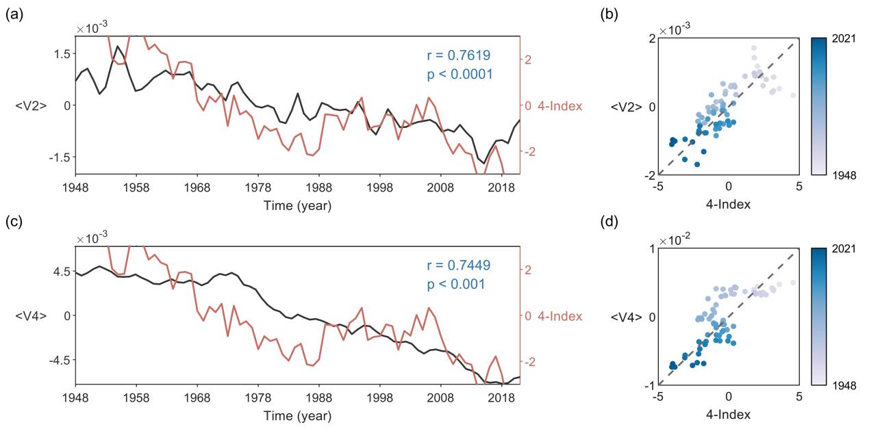 图1: 1948 - 2021年EM2和EM4时间模态(V2和V4)的年均值与4个夏季风指数(4- index)组合值的关联分析。图1(a)和1(c)显示了V2和V4的年平均值与澳大利亚季风指数(AUSMI)、南美季风指数(SAMSMI)、南亚季风指数(SASMI)和西非季风指数(WASMI)四种季风指数组合值的相关性。图1(b)和1(d)显示了V2和V4的年平均值与季风指数组合值之间的关系。结果观测到显著的相关性,其中V2主要反映影响季风环流的陆海热对比,V4代表影响季风降水模式的热带气候波动。这些比较提供了本征微观模态与全球季风系统之间联系的见解,强调了陆海对比和热带动力在驱动区域气候变率方面的作用。