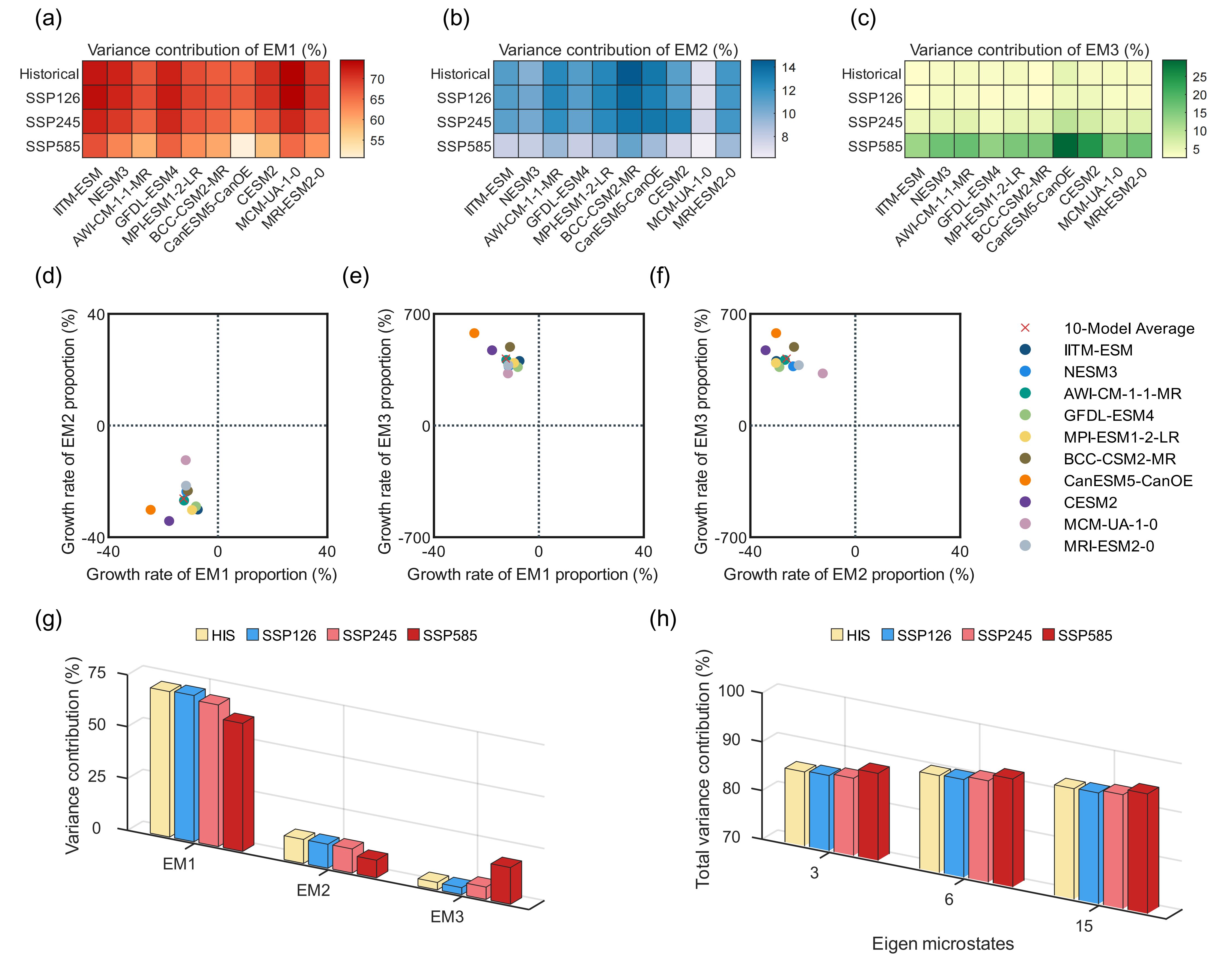 图3: 不同本征微观模态对不同气候变暖情景的响应。图3(a) - 3(c)分别显示了历史historical、SSP126、SSP245和SSP585情景下10个CMIP6模式中前三大本征模态的比例变化。图3(d) - 3(f)显示了SSP585情景下与SSP126情景相比,前三大本征模态比例的成对变化率,计算公式为增长率= (SSP585 - SSP126) / SSP126。图3(g)显示了历史historical、SSP126、SSP245和SSP585情景下10个CMIP6模式中前三大本征模态的平均比例。图3(h)显示了在相同情景下,前三大、前六大和前十五大本征模态的总平均比例。