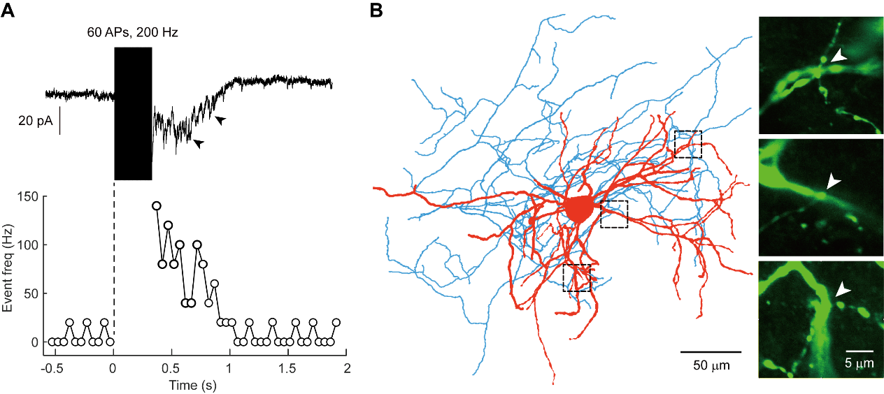 近期,系统科学学院王大辉教授团队博士生王轩与复旦大学脑科学转化研究院舒友生教授团队合作,结合神经科学的实验技术和神经系统的计算模拟,对纹状体神经元的自突触进行了深入探索。在急性分离的小鼠脑片上,研究人员对纹状体神经元进行全细胞记录,利用动作电位高频爆发后自突触上延迟出现的神经递质非同步化释放(asynchronous release, AR)现象来识别记录的神经元是否具有功能性自突触。惊讶的是,所有记录到的SPN在动作电位爆发后都没有自突触的AR现象,即使是在细胞外液中存在促进AR的锶离子(Sr2+)的情况下也没有出现AR,提示SPN并没有发育出自突触结构。相反,在另一类纹状体神经元,即小清蛋白(Parvalbumin,PV)阳性的中间神经元上,我们在约半数的记录细胞中观察到了稳定的自突触AR事件(附图A),同时在形态学上也观察到了可能的自突触位点(附图B)。