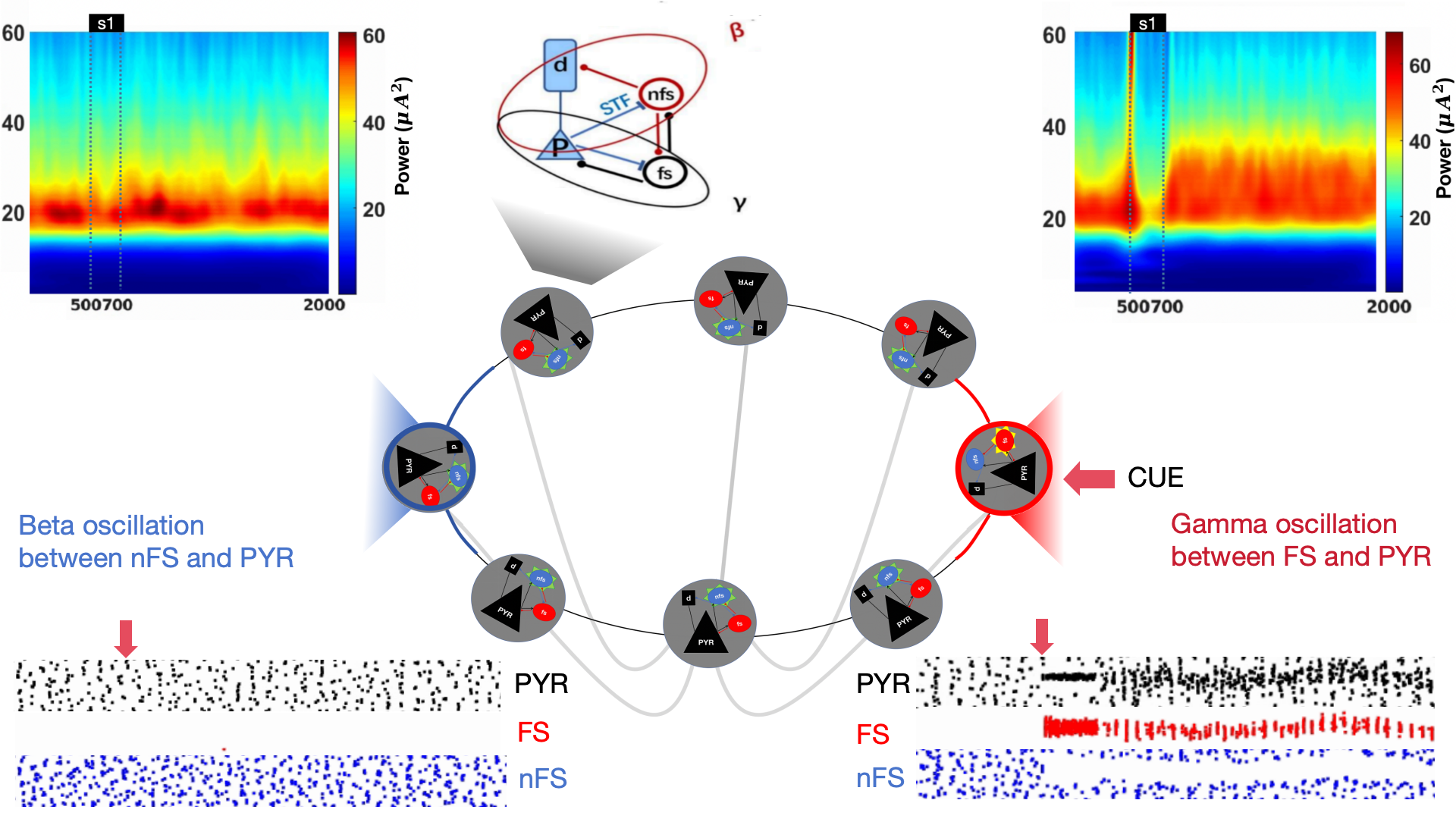 Pyr、FS和nFS根据偏好角度均匀的排布成圆环,根据细胞在圆环上的位置建立循环兴奋性、抑制性连接,相近位置的神经元连接更强。同时呈现刺激时,模型通过引发独立的可持续局部振荡活动“oscillatory activity bump”保存每一个刺激的信息;序列呈现刺激时,新的刺激在新的偏好方向引发局部持续振荡,保存序列呈现的信息。各个刺激引起的局部持续活动之间具有相互竞争的作用。在持续活动过程中,局部场电位表现出Gamma和Beta振荡共存的特点。在刺激的非偏好方向,低阈值nFS细胞和兴奋性Pyr细胞形成Beta振荡,在刺激呈现的偏好方向,高阈值的FS细胞被激活并和兴奋性Pyr细胞形成Gamma振荡。Gamma 振荡强度随工作记忆负荷增加而增强,揭示工作记忆中Gamma burst和Beta burst共存的机制。