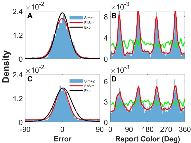 近期,系统科学学院王大辉教授团队,通过神经动力学建模与数值模拟,揭示了聚集报告现象与报告偏差分布的可能神经动力学机制。团队成员利用环状神经元网络,将不同颜色便好的兴奋性神经元按照偏好特征放置在圆环上,表征色环上相应角度的颜色。研究发现当兴奋性神经元之间的突触连接为异质性,且这些突触连接具有短时可塑性(Short-Term Plasticity),网络模型可以较好地复现出实验中的现象。如附图A,C所示,模型所得到的报告的偏差分布(蓝色柱状图)是高斯形的,且与实验分布(黑线)接近。附图B,D表示报告分布(蓝色柱状图)呈现出明显的多峰特征,偏离了刺激的均匀分布(绿色曲线)。