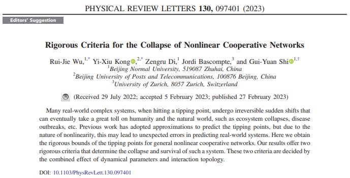 研究成果以“非线性合作网络崩溃的严格判据”(Rigorous criteria for the collapse of nonlinear cooperative networks)为题,于2023年2月27日被物理学顶级期刊《物理评论快报》(Physical Review Letters)接收发表,并被选为编辑推荐(Editors' Suggestion)在期刊主页高亮展示。研究工作主要在国家自然科学基金重点项目(批准号:71731002)的资助下完成。北京师范大学复杂系统国际科学中心吴蕊洁博士为论文的第一作者,史贵元副研究员为论文的通讯作者。北京师范大学珠海校区为论文的第一完成单位和通讯作者单位。