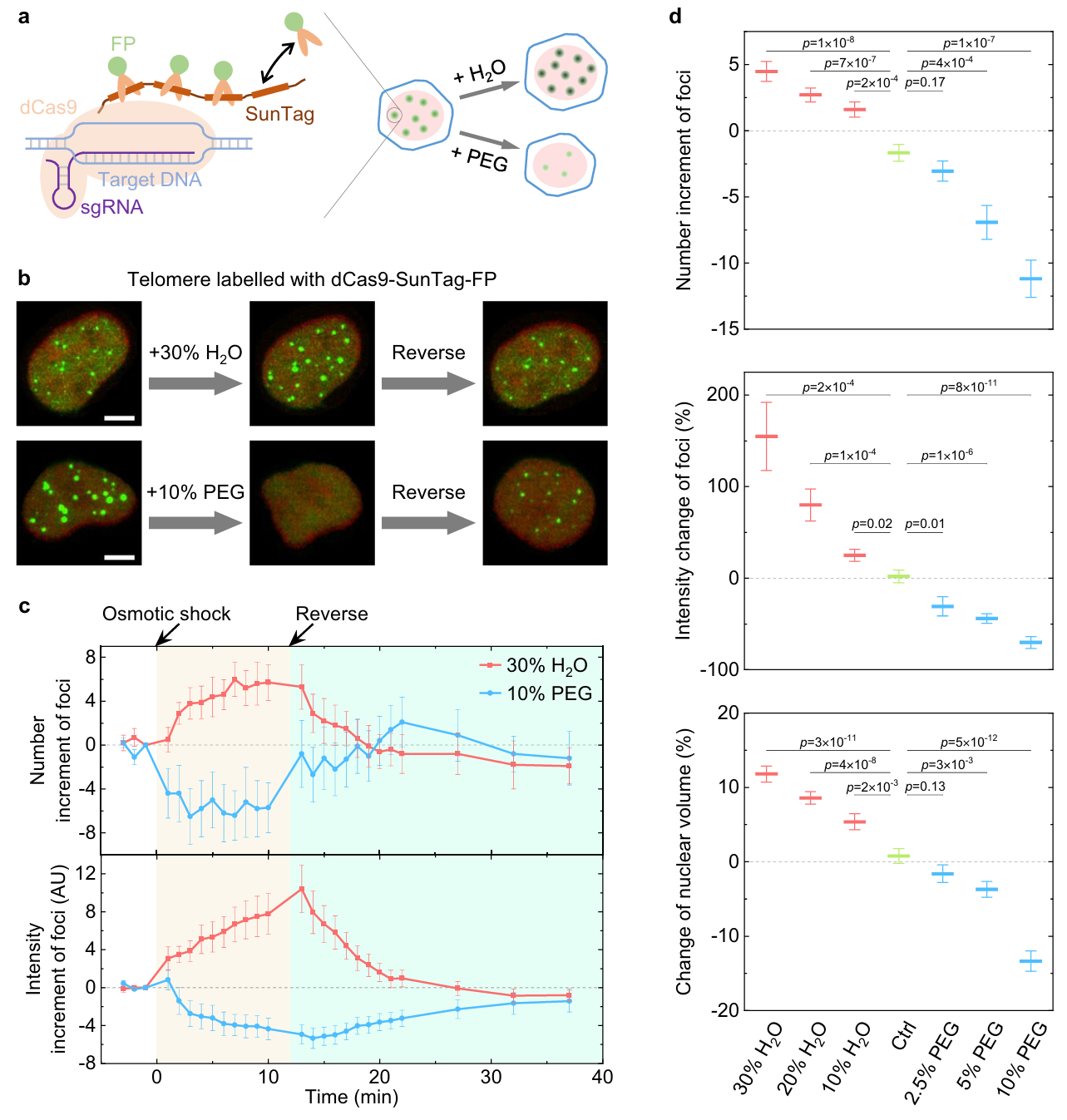 图1. 渗透压对dCas9-SunTag系统标记DNA效率的快速、可逆调控