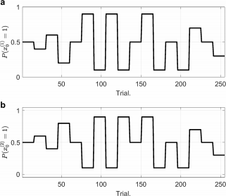 图2: 两个臂的期望状态。 a.Arm A的期望状态随时间的变化(黑线)。b. Arm B的期望状态随时间的变化(黑线)。