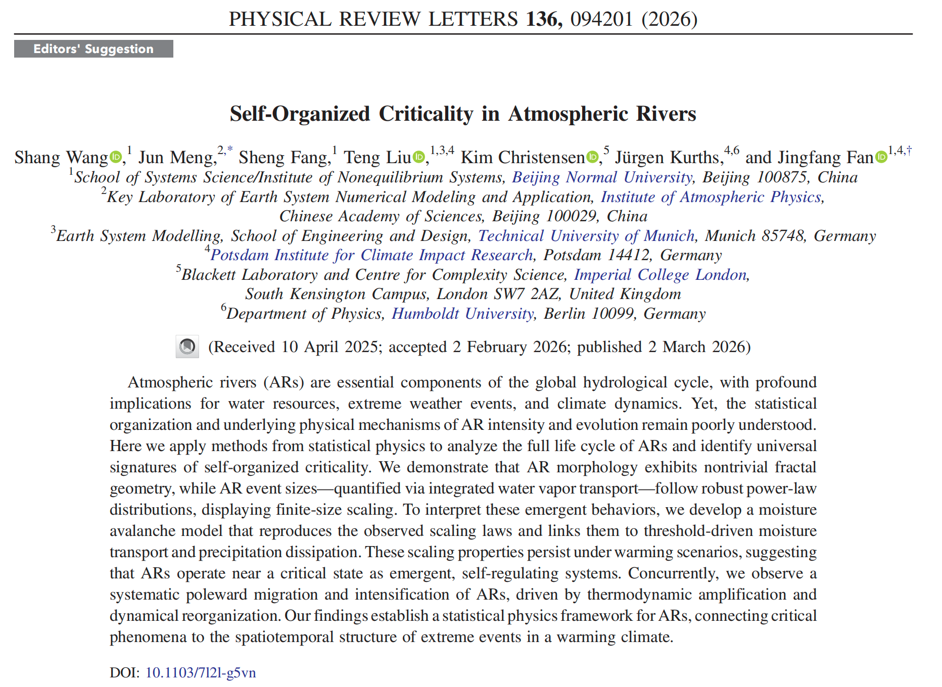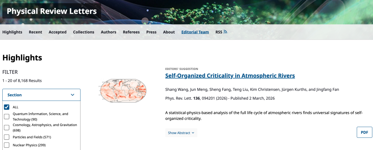 本研究为大气河建立了一个统计物理意义上的统一理论框架,首次在地球水汽输运系统中系统验证了自组织临界统计结构。 该成果: 将非平衡相变理论拓展至气候系统尺度; 将雪崩动力学与分形标度理论引入水循环研究; 将复杂系统临界理论应用于极端水文气候事件形成机制。 这一工作不仅深化了对大气河物理本质的理解,也为极端事件预测、气候风险评估与防灾减灾提供了新的理论支撑。 论文被PRL选为 Editors’ Suggestion,代表该成果在国际物理学界具有重要理论意义与广泛学术影响。
