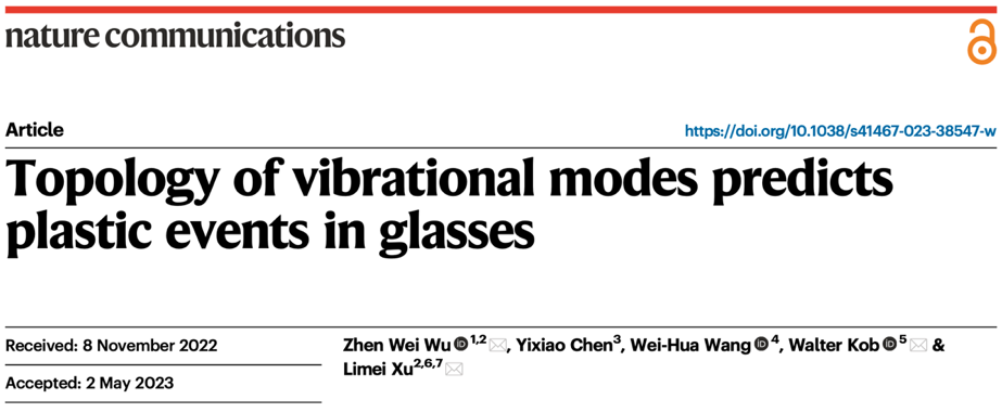 2023年5月24日,北京师范大学系统科学学院、非平衡系统研究所武振伟副教授及其合作者,北京大学元培学院陈一潇(普林斯顿大学博士研究生),中科院物理所汪卫华院士,法国蒙彼利埃大学Walter Kob教授,以及北京大学物理学院徐莉梅教授,关于玻璃态物质振动模式中拓扑缺陷与塑性事件关系的研究工作,以“Topology of vibrational modes predicts plastic events in glasses”为题在线发表于国际学术期刊《Nature Communications》。