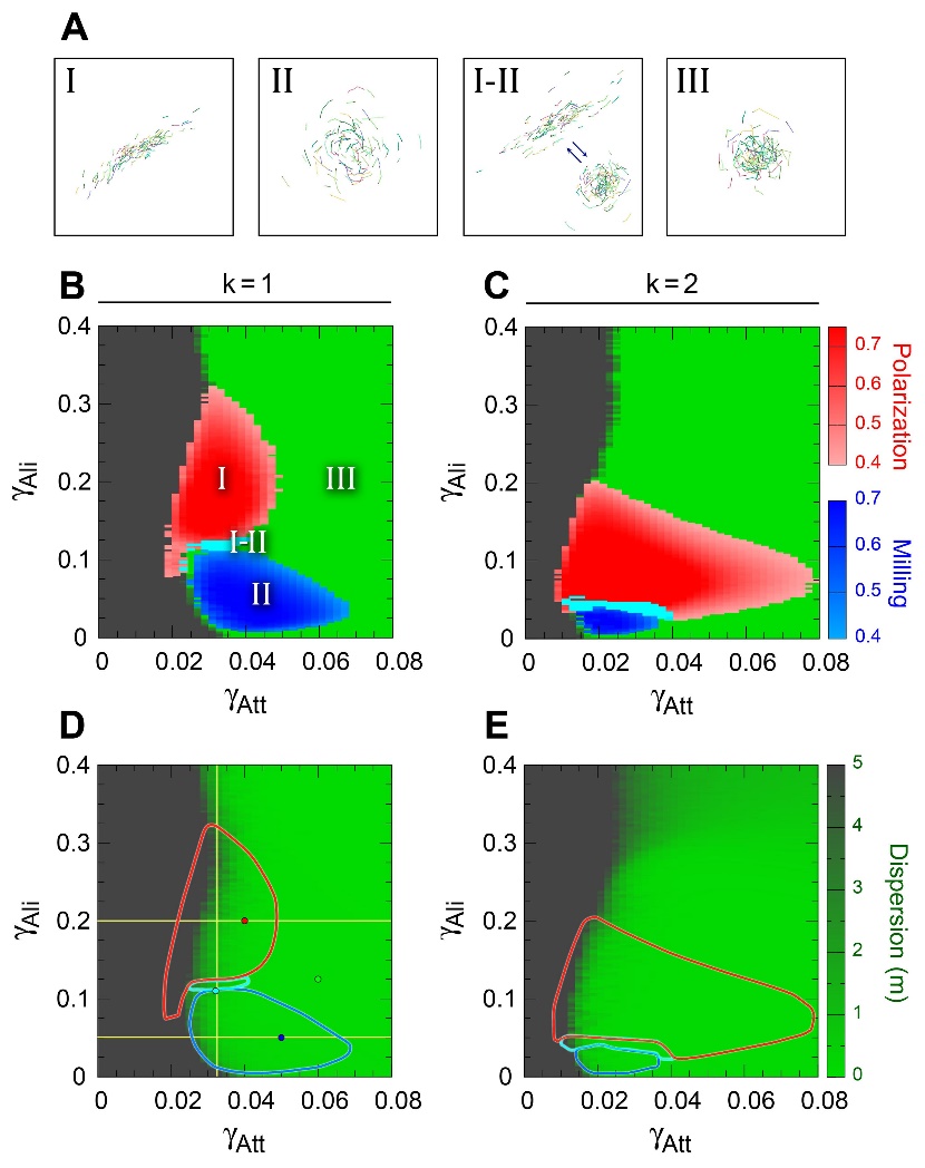 近期,系统科学学院韩战钢教授团队博士生王伟嘉与法国图卢兹三大Guy Theraulaz教授合作,基于红鼻剪刀鱼(Hemigrammusrhodostomus)数据驱动模型对鱼类认知和环境感知能力与集群运动状态的联系进行了深入研究。该模型由红鼻剪刀鱼运动轨迹数据重构得到,完整描述了“加速—滑行”(burst-and-coast)运动模式下个体间的社会性相互作用以及多源信息整合方式。在此基础上,该研究系统分析了相互作用策略、相互作用强度与范围、个体行为随机波动以及群体规模对鱼群协同运动能力的影响。研究发现,当群体在吸引作用下保持聚集时,1至2个最有影响力邻居的方向信息即可使群体实现协同运动;一致性游行与同向环绕的形成则依赖于方向对齐作用。其次,相互作用强度与范围对集群运动状态的影响等价,其持续增加并不意味着聚集程度与协同能力的提高,过强的相互作用将使群体进入蜂拥状态。此时社会性相互作用与行为随机波动的作用相同。最后,群体在不同规模下均可形成稳定的集群运动状态。