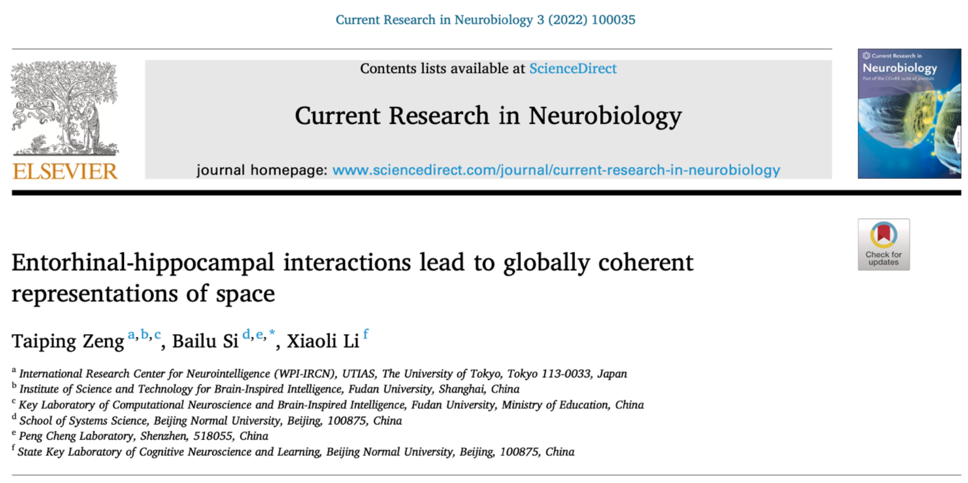 2022年第3期的《当代神经生物学研究》(Current Research in Neurobiology)发表了题为《内嗅皮层与海马交互形成空间全局一致编码》(Entorhinal-hippocampal interactions lead to globally coherent representations of space)的研究论文。该研究由东京大学曾太平博士在北京师范大学系统科学学院斯白露教授的指导下完成。该研究构建了一种内嗅皮层与海马交互作用的导航模型,从理论上为网格细胞可以作为动物导航的统一全局空间度量提供了依据。