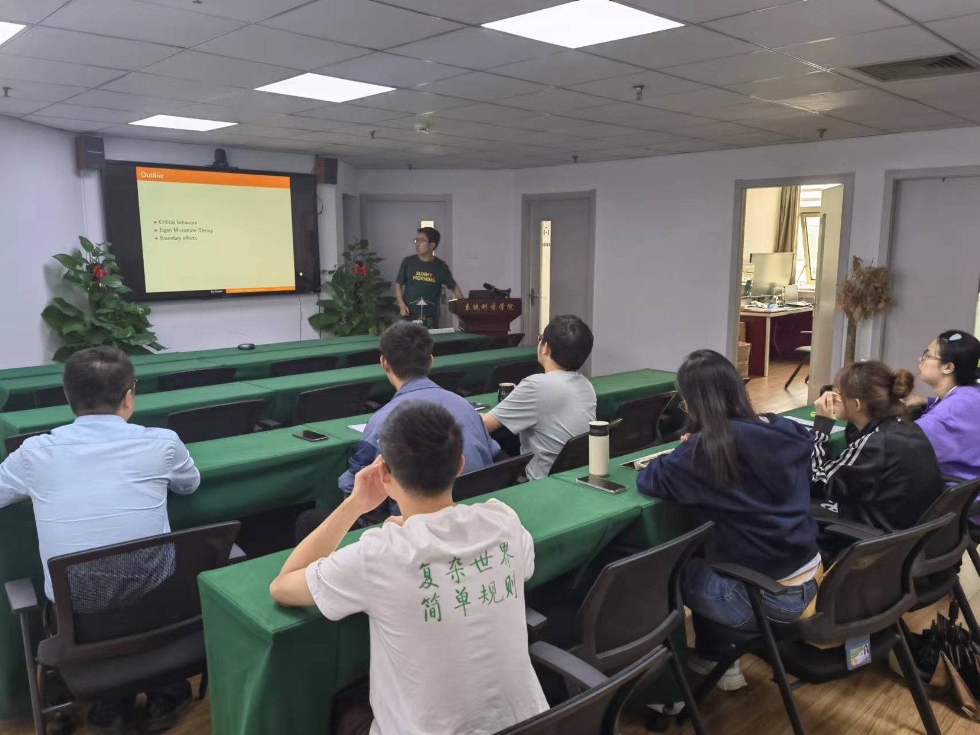 胡高科副研究员的报告题目为“Emergence of inhomogeneous phases under non-periodic boundary conditions and finite-size scaling”。他介绍了如何利用复杂系统基本理论探索非周期边界条件下非均匀相的涌现,生动阐述了相关研究成果。