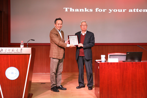 讲坛报告结束后,陈晓松教授代表系统科学学院赠予欧阳钟灿院士 “主讲嘉宾”证书,以纪念和感谢欧阳钟灿院士对系统科学高端讲坛的贡献和支持。