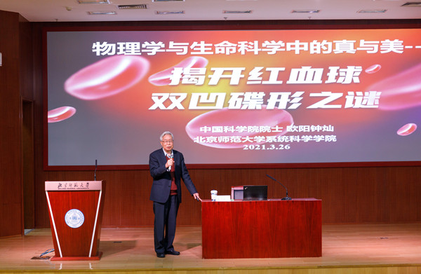 2021年3月26日,系统科学高端讲坛第一讲在北京师范大学京师学堂京师厅举行。第一讲的主讲嘉宾是中国科学院院士欧阳钟灿教授,讲坛主题是 “揭开红血球双凹碟形之谜”。本次讲坛活动由系统科学学院院长陈晓松教授主持,线下线上同步进行,除了北京师范大学师生积极参加,兄弟院校的四十余人线上参加了讲坛活动。