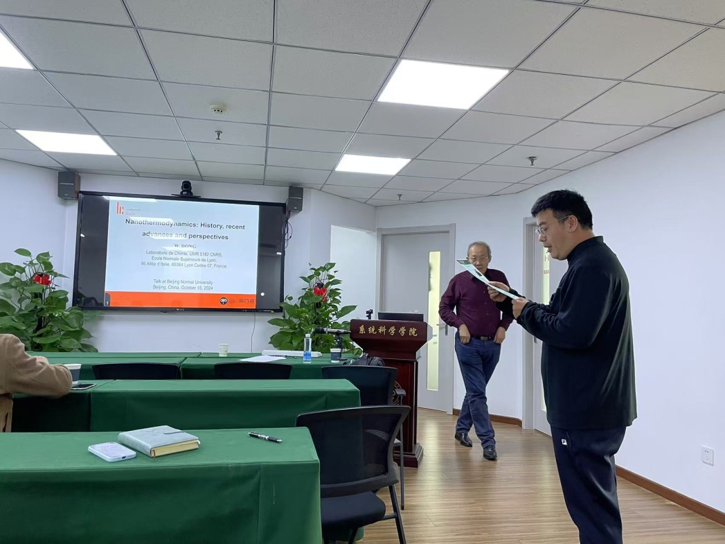 2024年10月16日,北京师范大学系统科学学院邀请法国里昂高师Wei Dong(董玮)研究员进行了题为“Nanothermodynamics: History, recent advances and perspectives”的学术报告。Wei Dong研究员在统计物理、液体理论(受限液体)、表面化学动力学、非均相催化、多孔介质等研究方面有着深厚的科研积累。近期在小体系(纳米尺度)热力学和表面张力的理论研究中取得了重要成果。