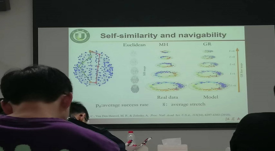 2023年4月21日下午15:00,江苏大学的郑木华教授在科技楼B604会议室做了题目为“self-similar transformation of complex network and is applications”的报告。郑木华教授分享了一个框架来研究不同分辨率的复杂网络中的对称性问题,以及证明了GR模型在按比例缩小的网络中产生了网络的多尺度展开,可用于预测人类连接体的多尺度自相似特性。同时提出了几何分支生长(GBG)模型的逆重整化变换,用于预测真实网络演化中的自相似分支生长,并解释观察到的对称性。讲座由系统科学学院樊京芳老师主持,现场有系统科学学院近20位师生参与了讨论。
