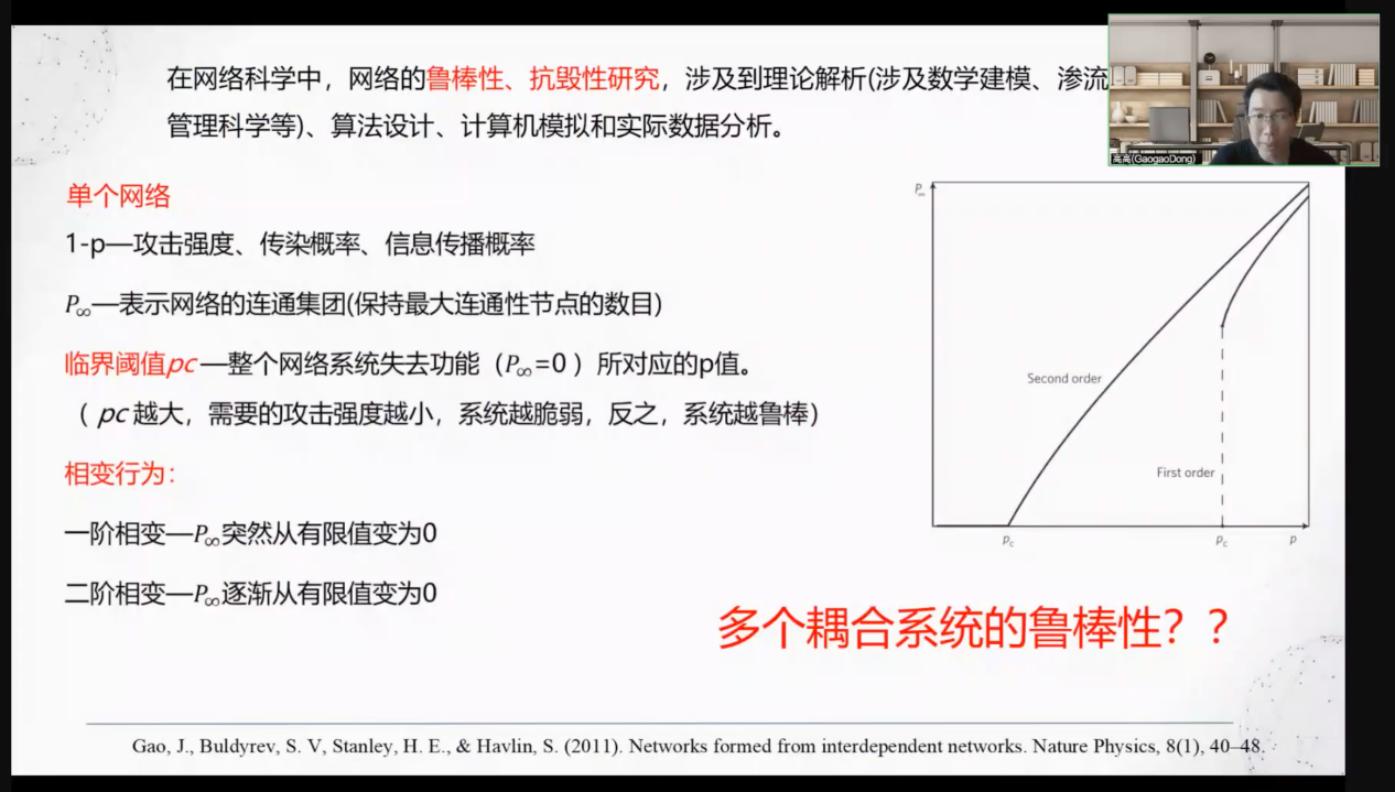 2022年10月11日下午15:30,江苏大学数学科学学院的董高高副教授在教八205教室做了题目为“广义复杂网络下的级联行为及中微观尺度下的网络鲁棒性分析”的报告。董高高老师分享了实际系统非均匀的异质耦合模态的级联行为的理论表达,发现当广义的耦合网络系统存在着最佳的耦合结构。讲座由系统科学学院樊京芳老师主持,现场有系统科学学院近90位师生参与了讨论。