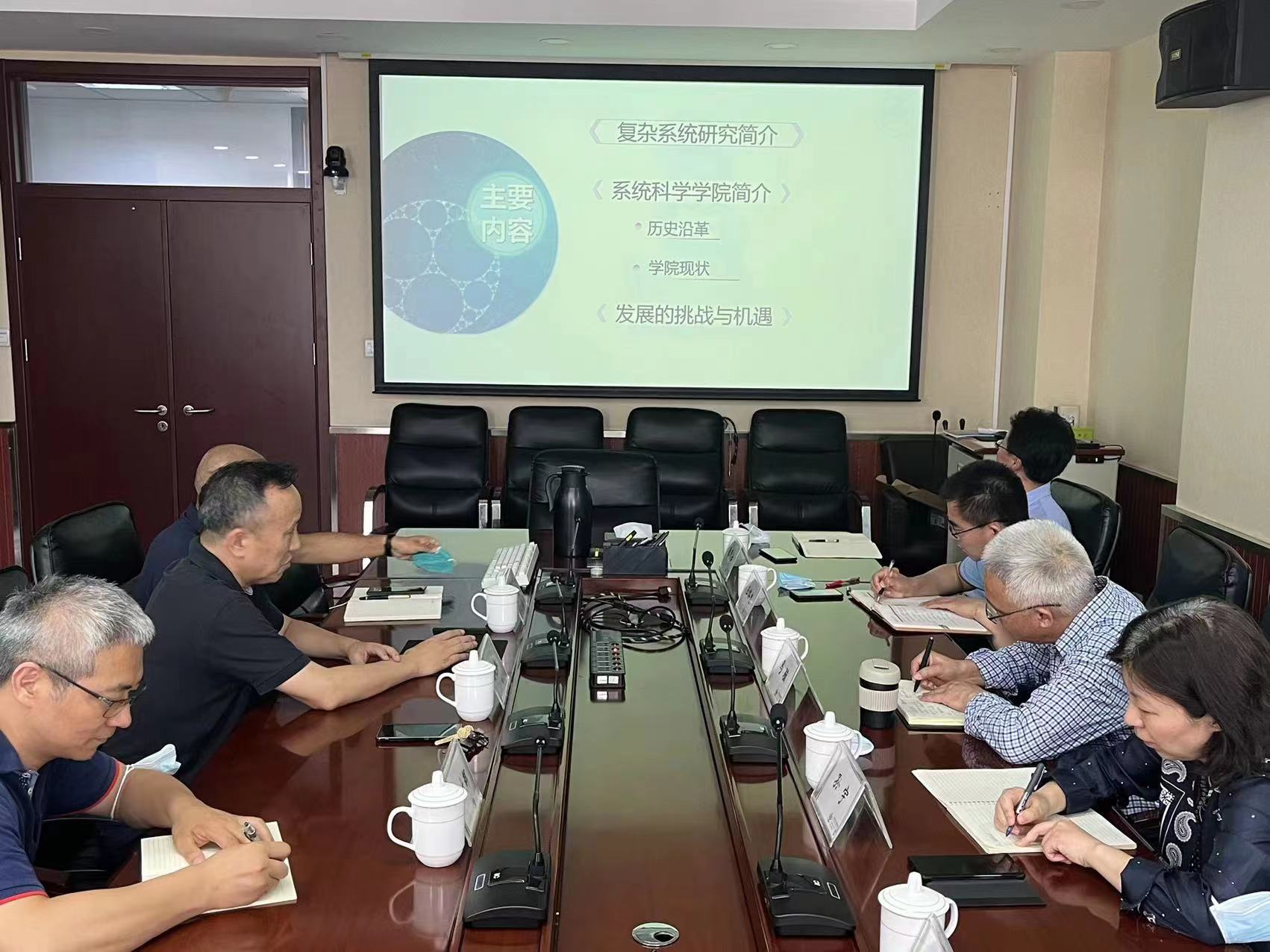 首先,陈晓松院长代表学院从复杂系统研究简介、系统科学学院历史沿革与现状、发展的挑战与机遇三大方面进行了介绍,并以数据为依据重点汇报了学院科学研究、人才培养和社会服务工作情况。周亚书记和王大辉副院长就相关内容进行了补充说明。