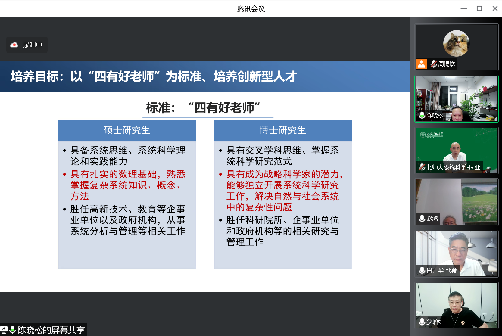 9月9日晚上20:00,北京师范大学系统科学学院研究生培养方案修订专家评审会在线上举行。中国科学院物理研究所汪卫华院士、南京大学物理学院马余强院士、中国科学院大气物理研究所段晚锁研究员、北京邮电大学理学院肖井华教授、厦门大学物理系赵鸿教授、中国气象局科技与气候变化司张兴赢副司长、北京师范大学地理科学学部效存德教授、北京师范大学物理系涂展春教授、北京师范大学系统科学学院狄增如教授担任评审专家,其中汪卫华院士任专家组组长。学院党总支书记周亚、研究生培养方案修订工作小组及学院重点建设课程负责人等十余人共同出席了本次专家评议会。会议由陈晓松院长主持。