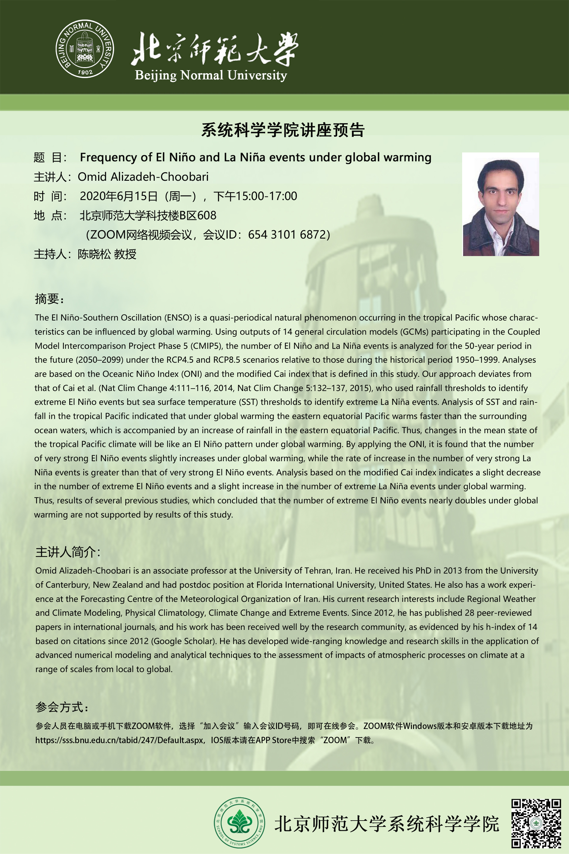 【讲座】全球变暖下极端厄尔尼诺和拉尼娜事件的发生频率(英文讲座)