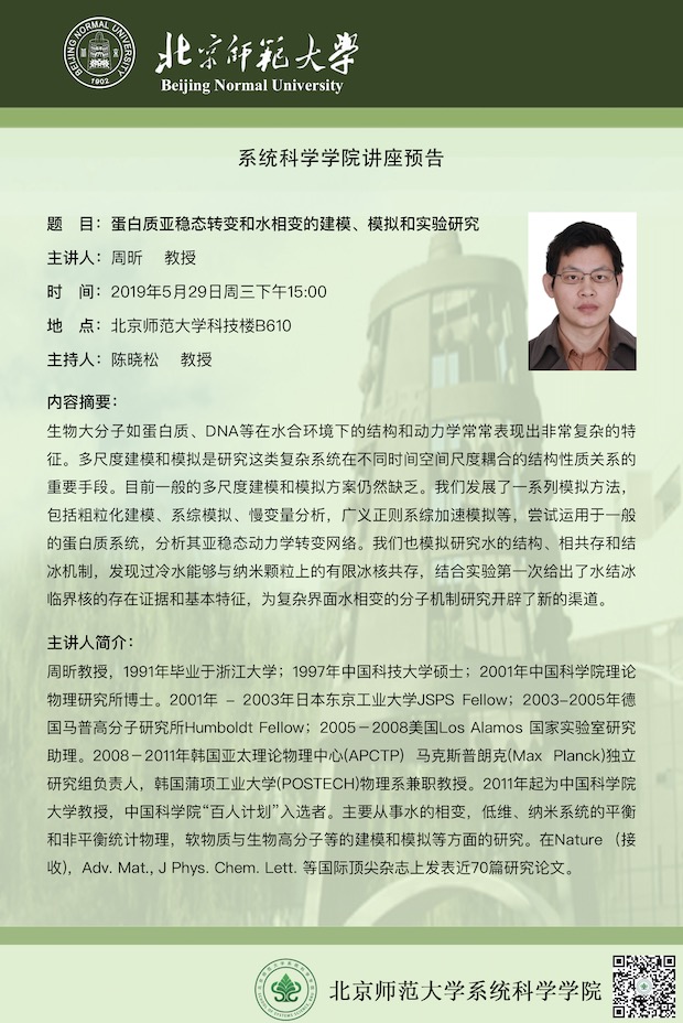 [讲座] 蛋白质亚稳态转变和水相变的建模、模拟和实验研究