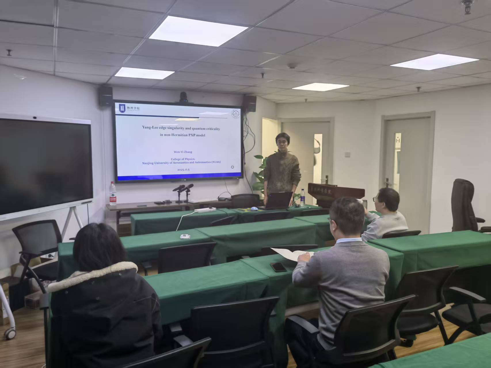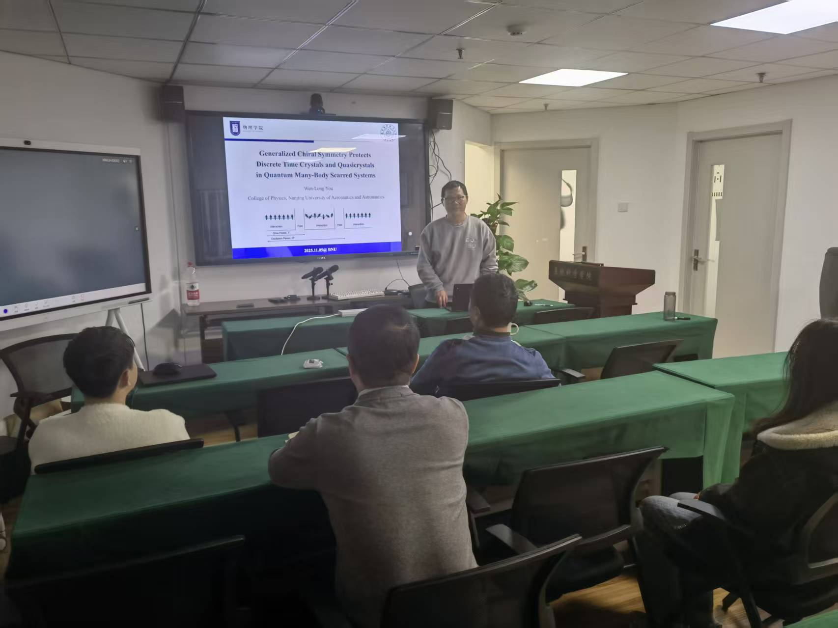 近日,复杂量子系统研究专家南京航空航天大学物理学院尤文龙研究员及其团队优秀博士研究生张文乙同学应邀来访我院,围绕量子复杂系统领域开展学术交流,并于2025年11月5日上午和下午为全院师生作了专题讲座。